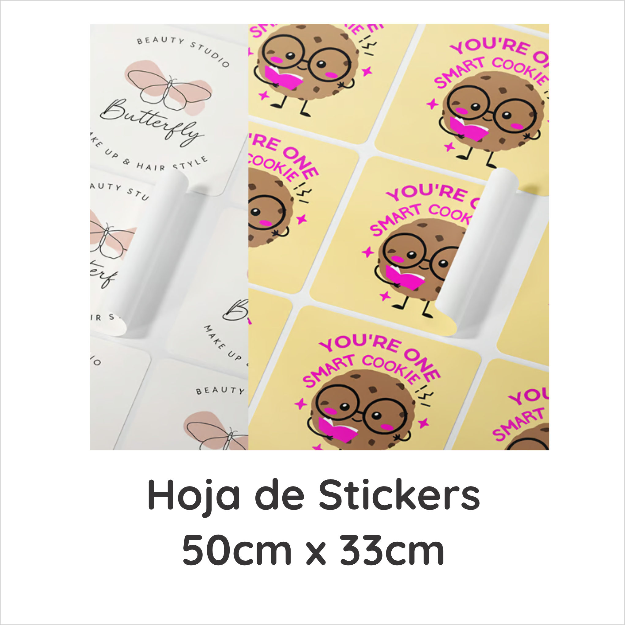 La hoja mide 50 cm x 33 cm, permitiendo optimizar costos al crear stickers más pequeños, como de 3 cm x 3 cm, ideal para pegar códigos QR de tus redes sociales o página web. De esta manera, puedes bajar el costo de tus stickers hasta $150 pesos, o incluso $110 pesos. ¡Una opción accesible y funcional para hacer crecer tu negocio!